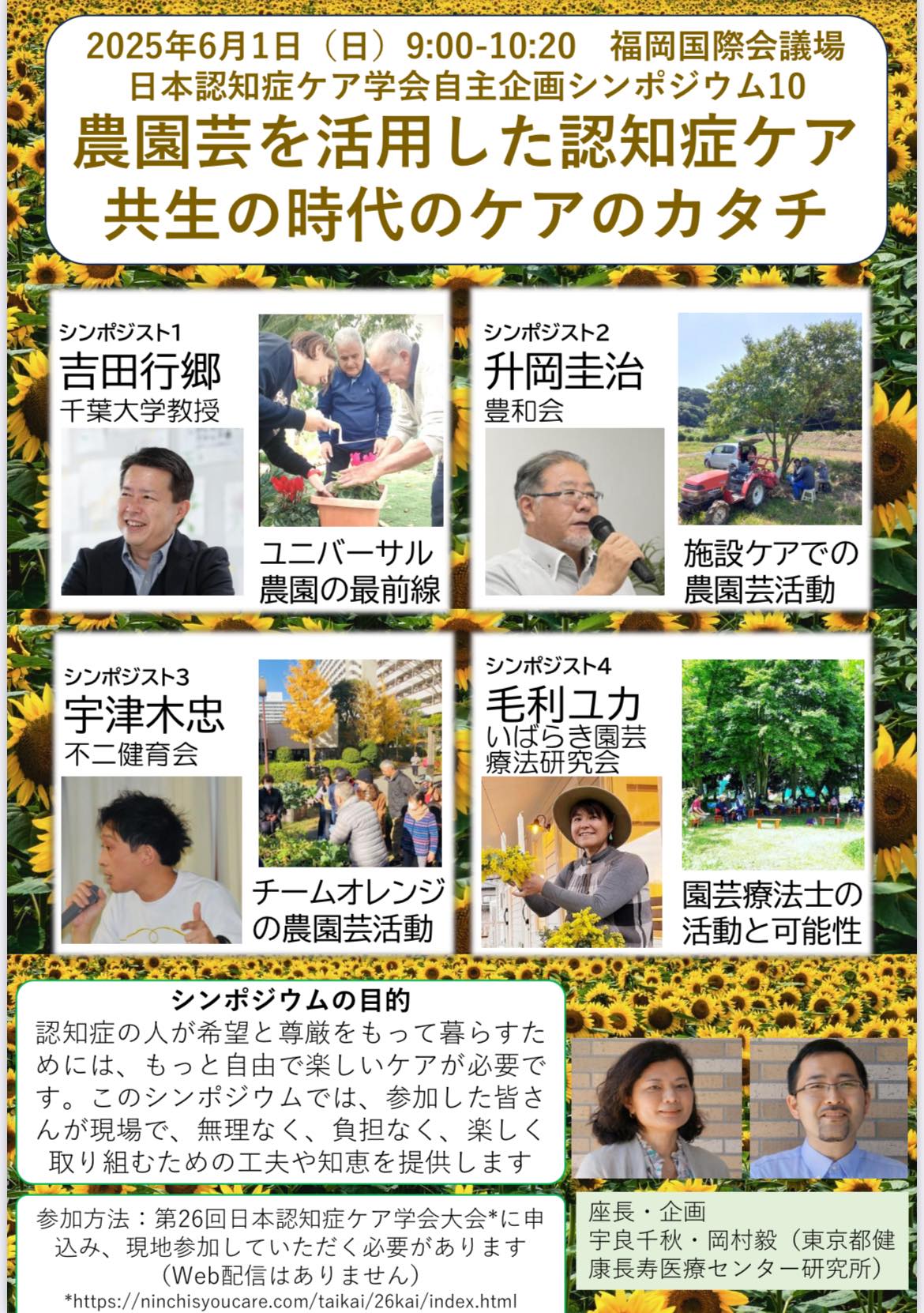 6月1日(日)には、宇良千秋氏(東京都健康長寿医療センター研究所 自立促進と精神保健研究チーム 研究員)が企画したシンポジウム「農園芸を活用した認知症ケア〜共生の時代のケアのカタチ〜」が実施されます。