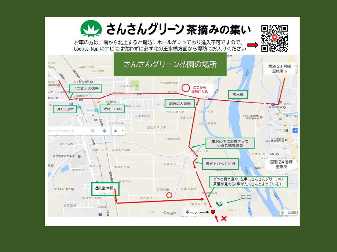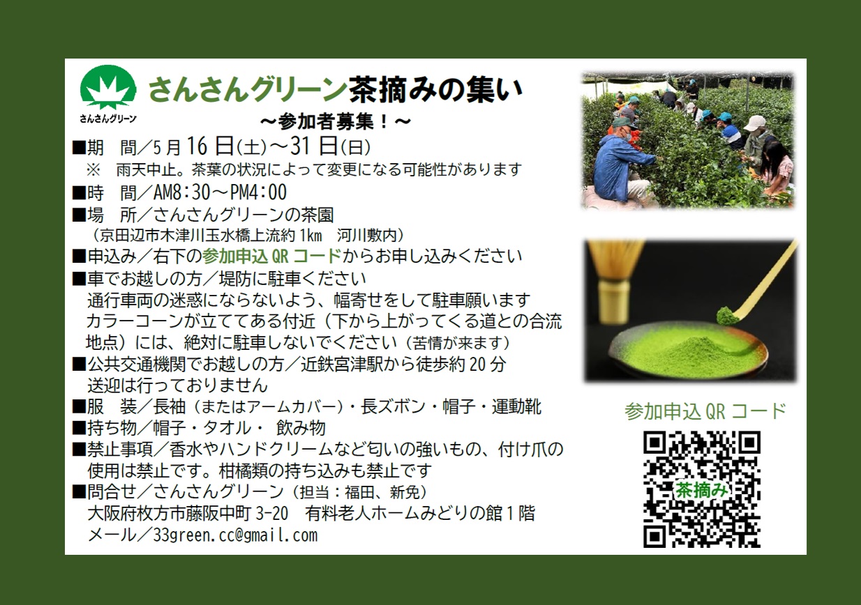 さんさんグリーン(大阪府枚方市)は、5月16日(土)〜31日(日)に京都府京田辺市の茶園で茶摘みの集いを開催します。